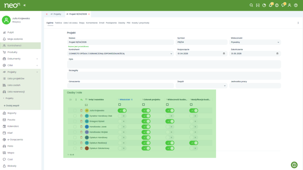 2. W zakładce „Ogólne”, w sekcji „Osoby i role”, dodaj członków projektu.